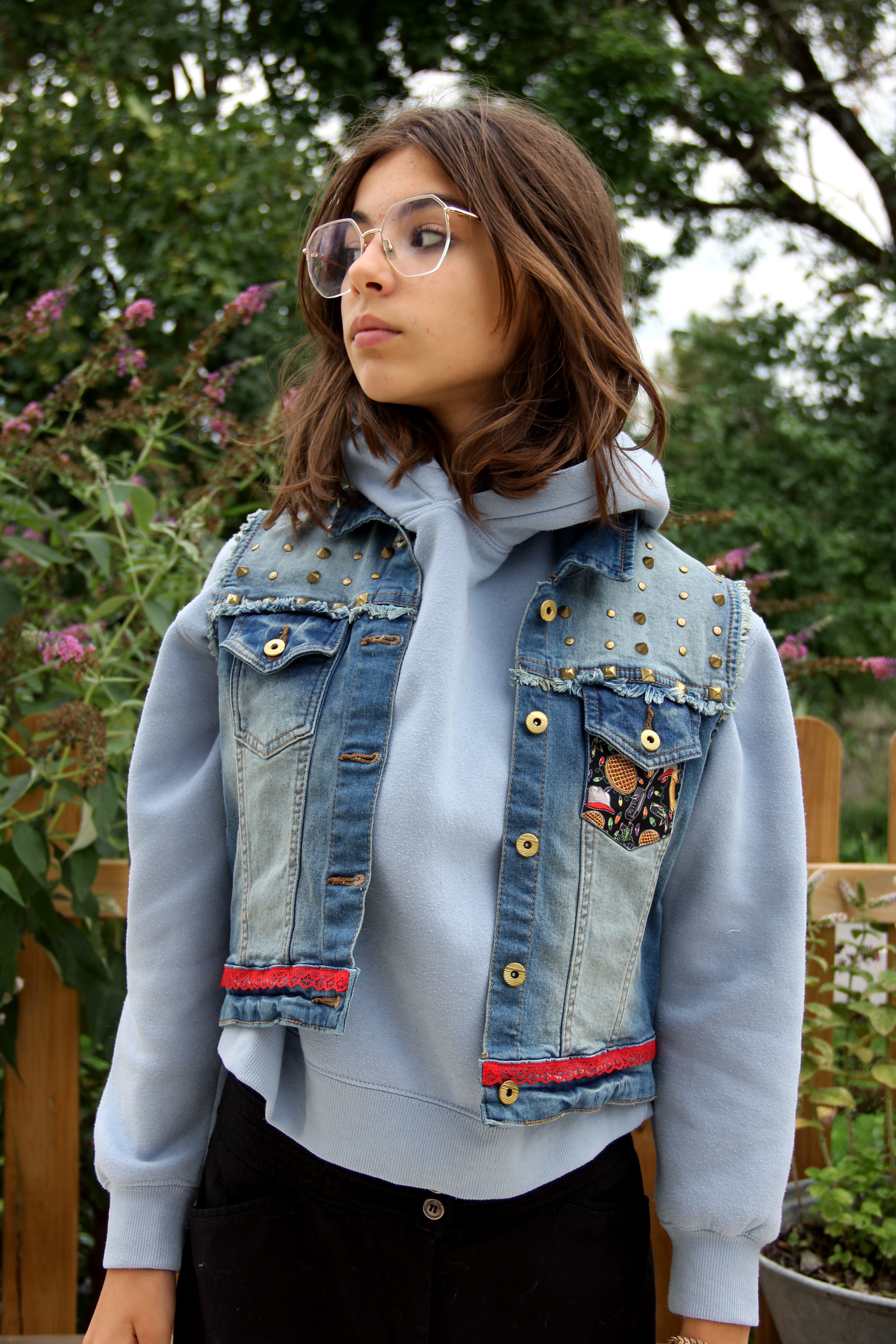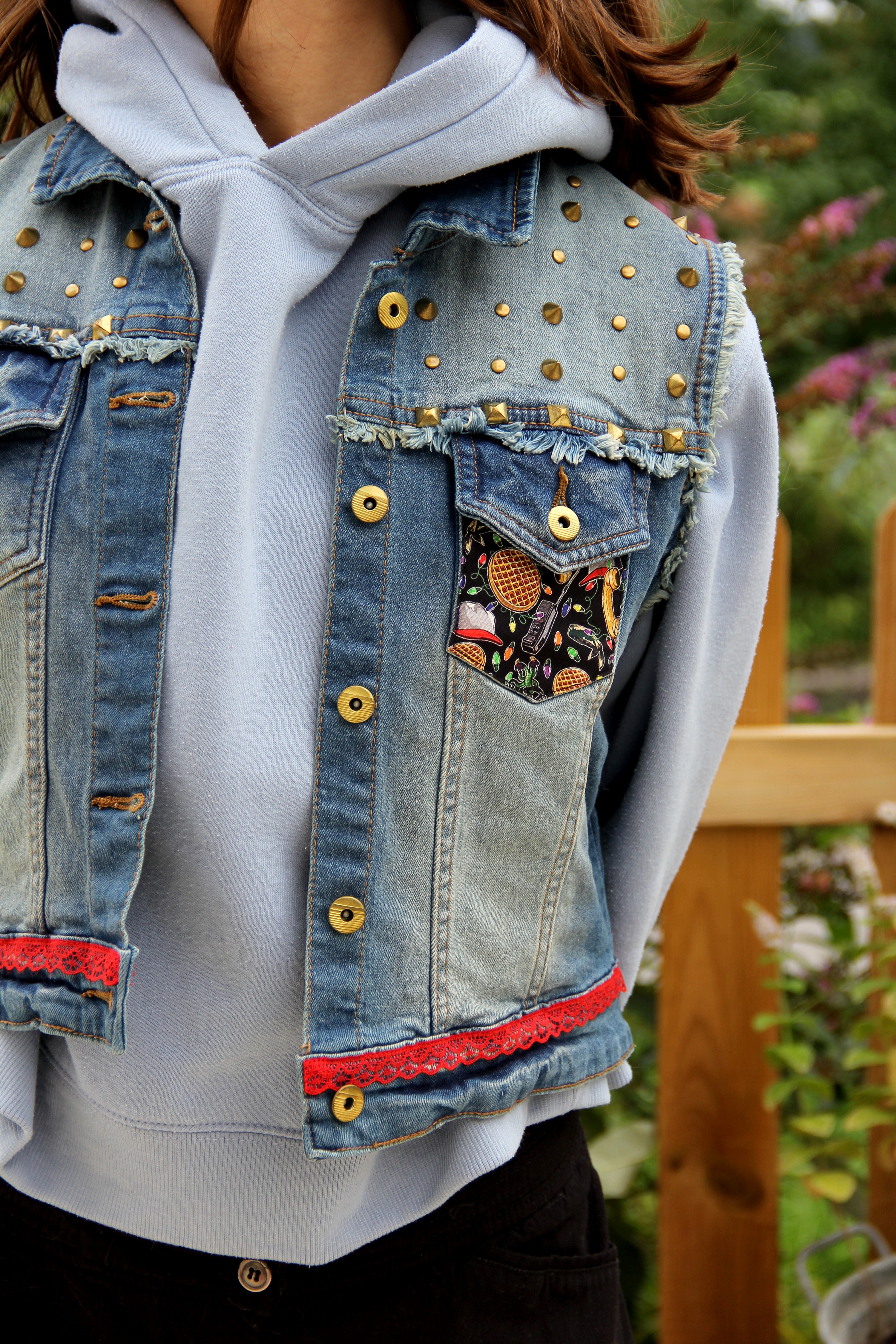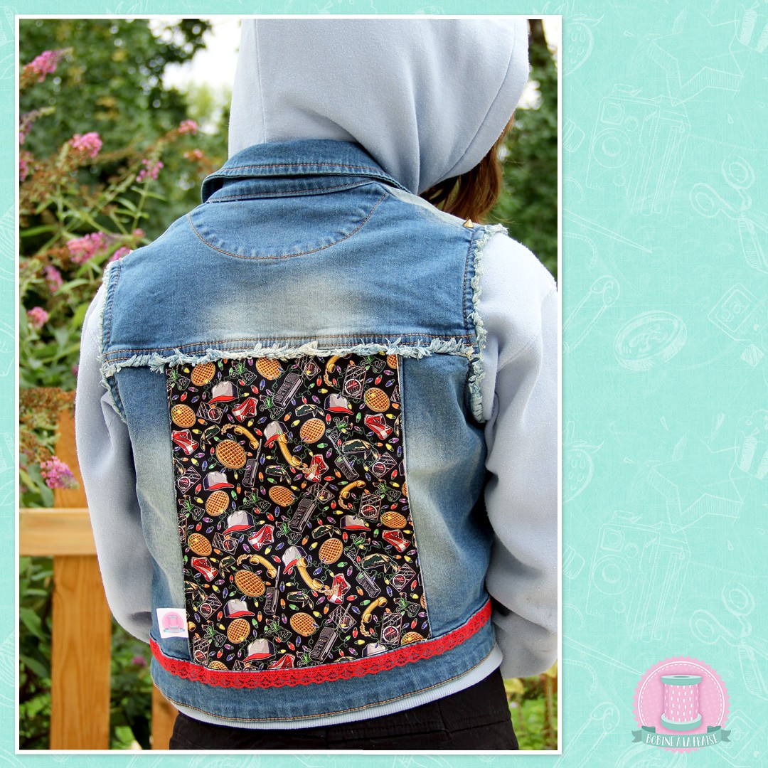 Une veste en jean sans manche en taille 38, customisée aux couleurs de Stranger Things, à porter léger ou au dessus d'un sweat ou d'une doudoune, pour une petite touche so 80's