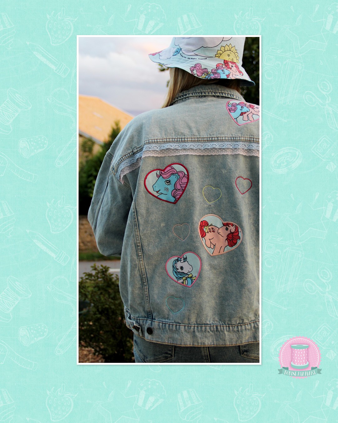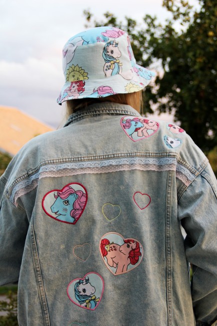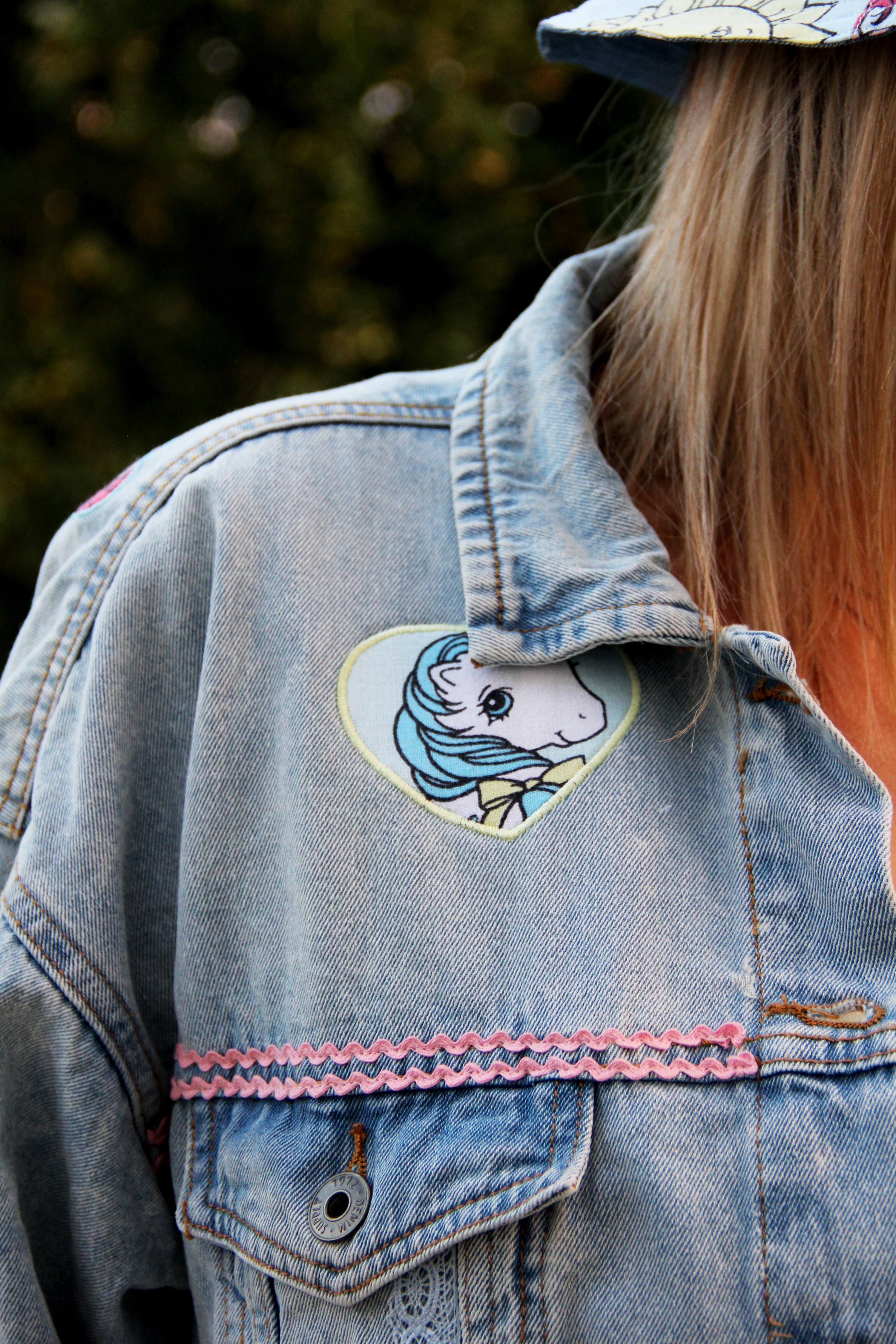 Veste large en jean en taille 42, customisée aux couleurs des petits poneys :)