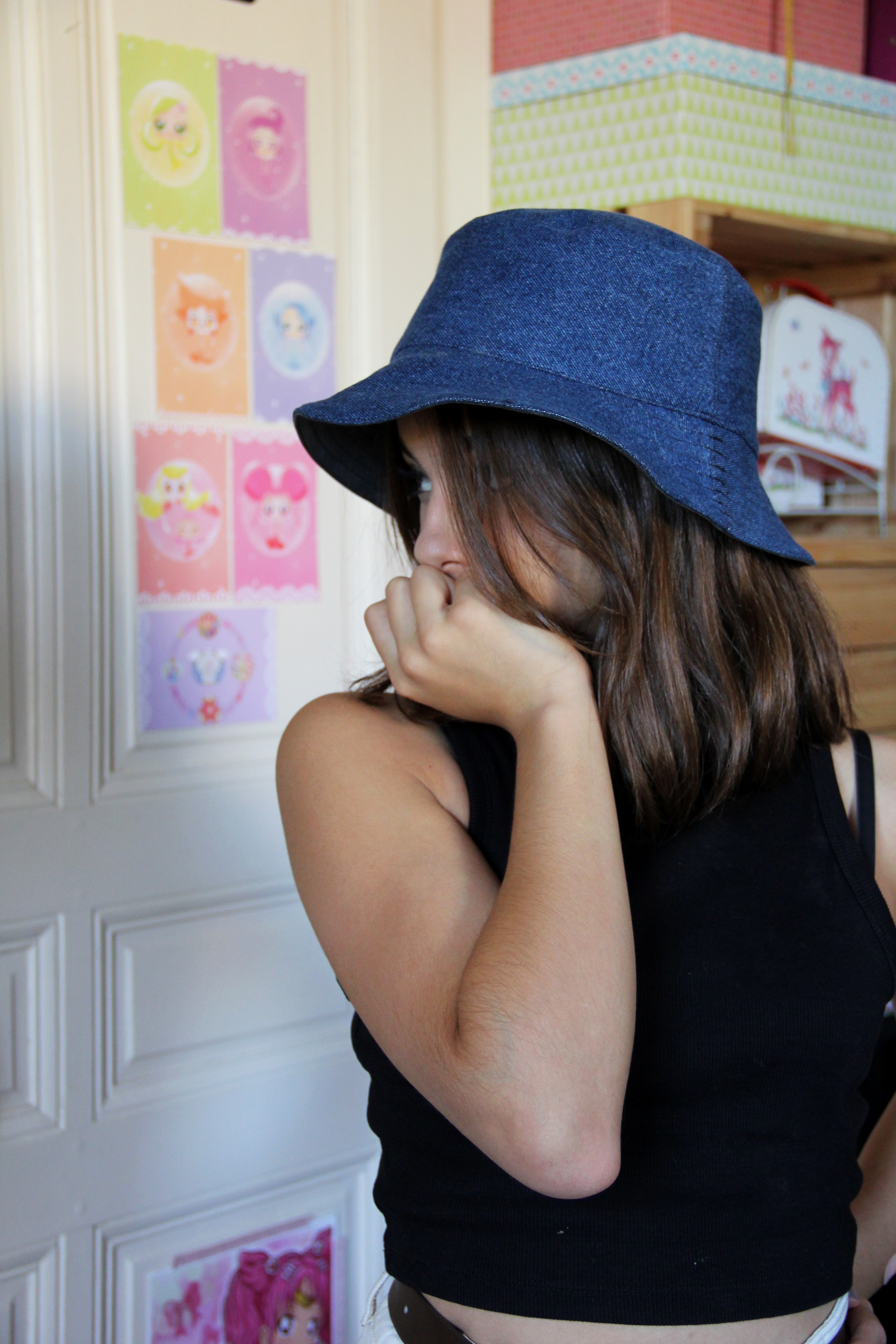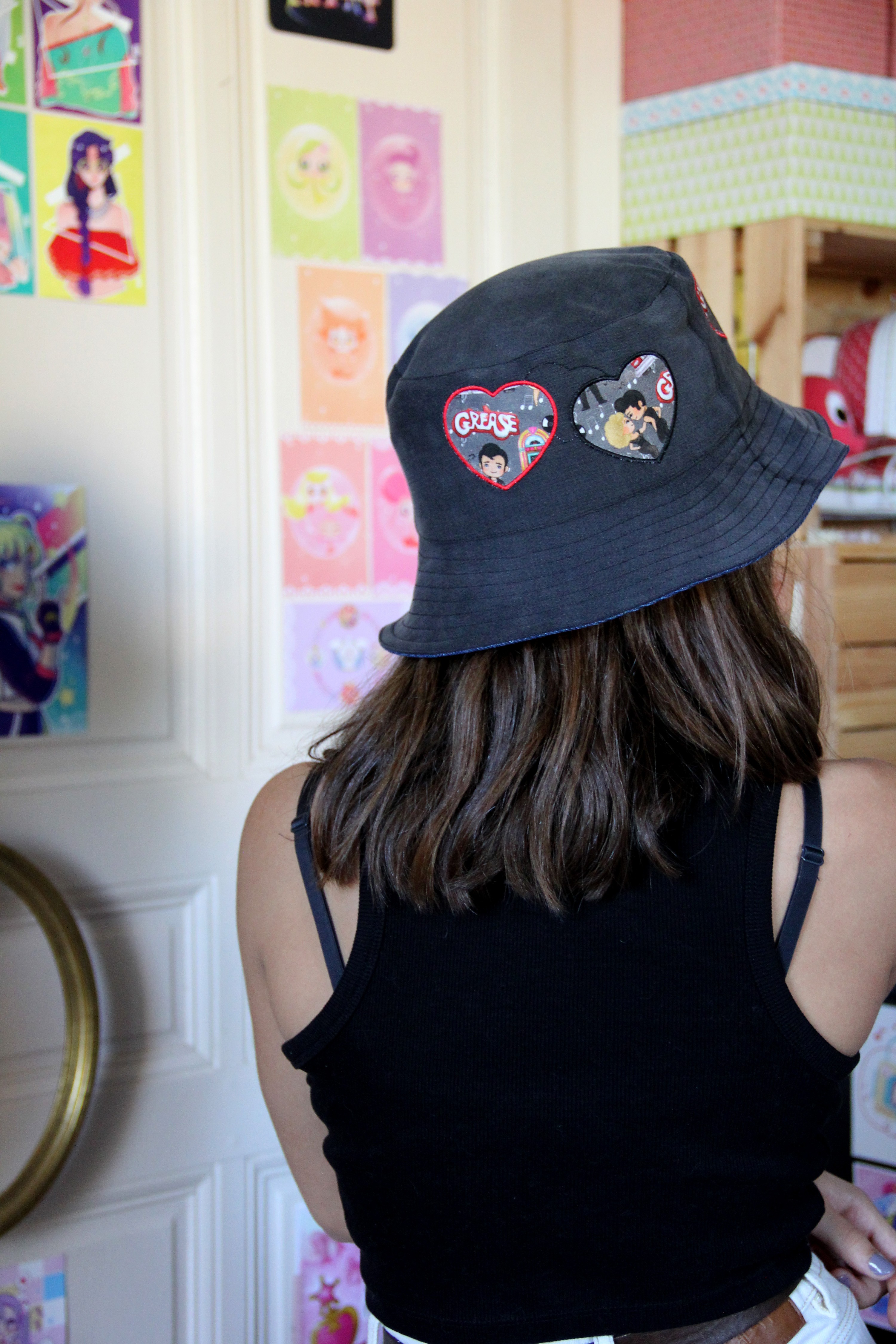 Bob cousu dans du denim upcyclé agrémenté de patchs aux couleurs de Grease, entièrement doublé aussi en denim Upcyclé, pourra donc se porter côté jean pour un look plus sobre :)